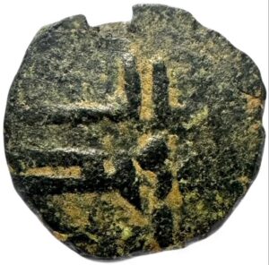 Note: The obverse displays tentatively a seven-branched menorah, a design reminiscent of the rare early Judaic tradition. Unlike some later variations of the Islamic Jewish fals, which reduce the menorah to five branches, possibly representing the Five Pillars of Islam, this coin preserves the full seven branches, with the branches extending above the top platform, an unusual feature that parallels some of the earliest rare Judaic menorah designs and it shares a similar base to the early seven-branched Islamic Jewish menorah.