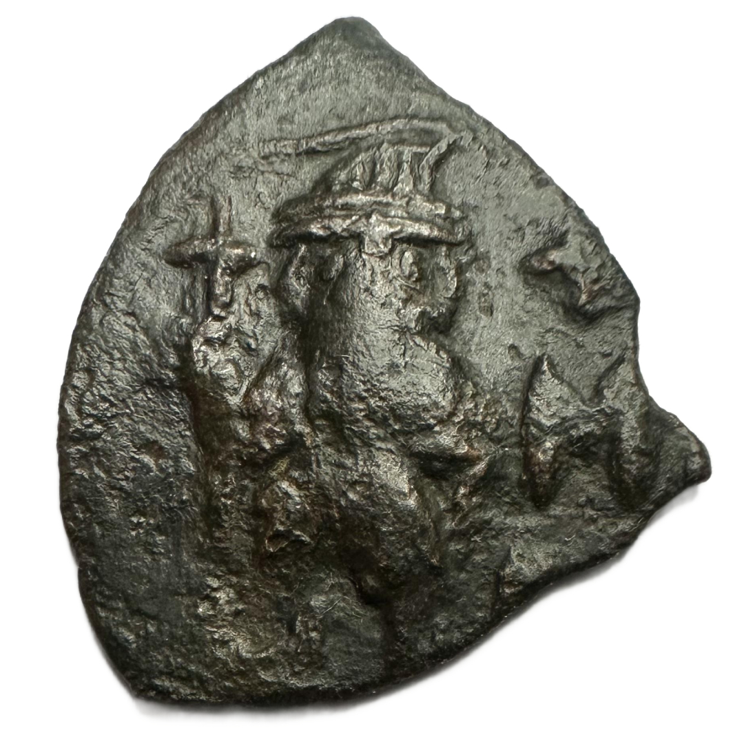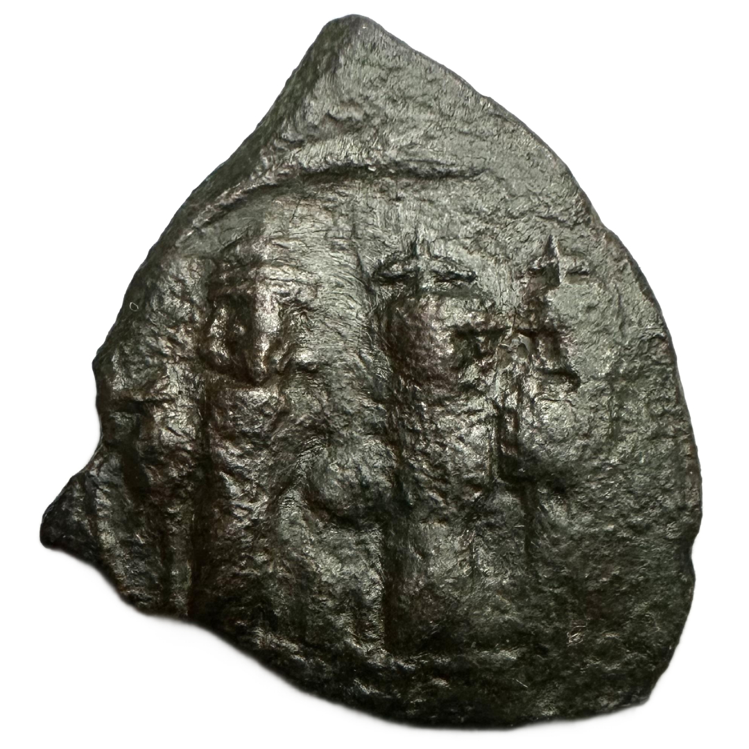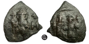 Note: This follisollis highlights Constans II’s military authority during a turbulent period of Byzantine-Arab conflicts. The reverse shows his sons,Constantine IV, Heraclius, and Tiberius, crowned and holding globus cruciger, emphasizing dynastic continuity and the emperor’s efforts to project both military and spiritual legitimacy across the empire.