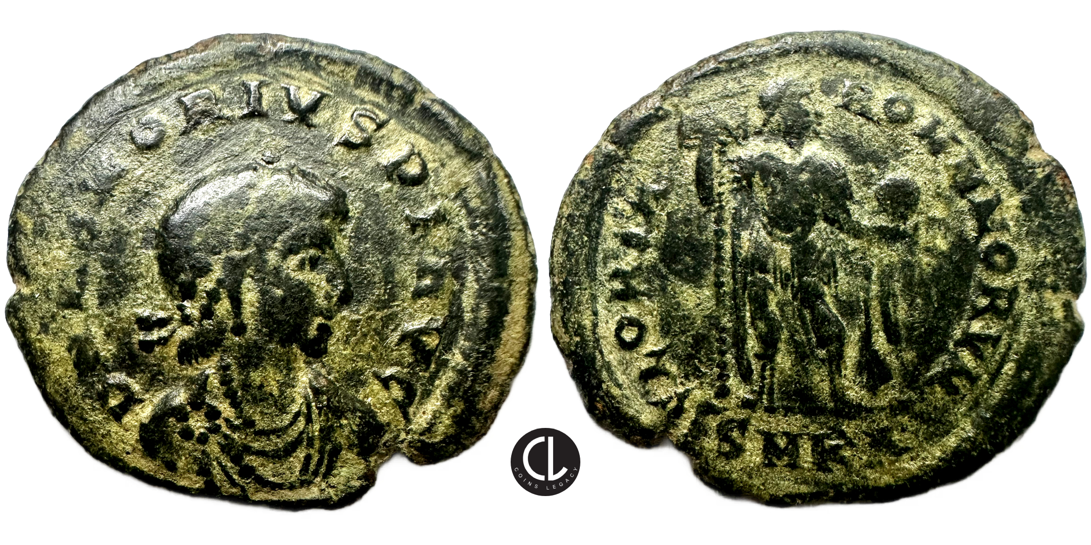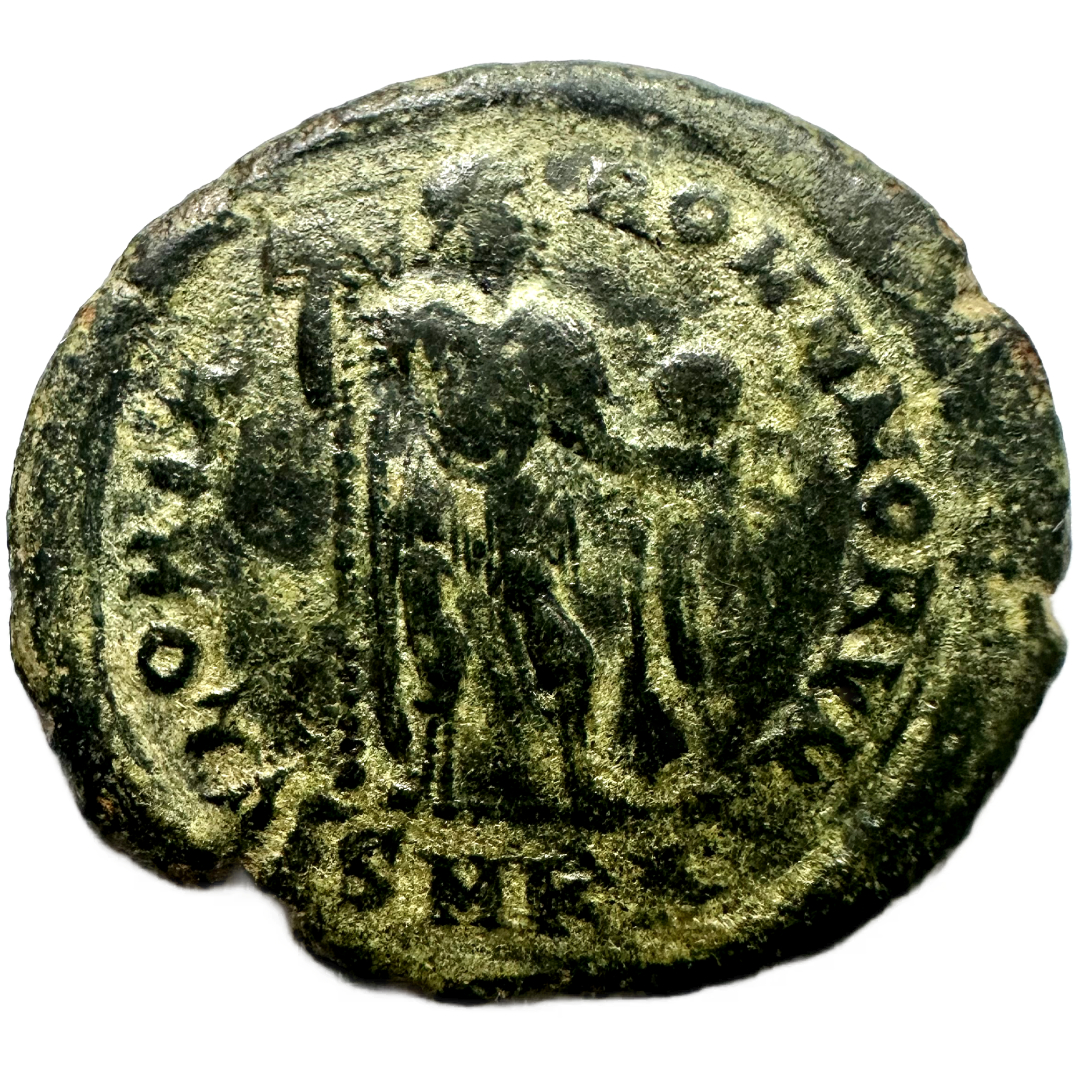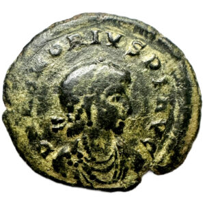 Note: Flavius Honorius, who reigned as the Western Roman Emperor from AD 393 to 423, was the younger son of Theodosius I. His reign coincided with one of the most challenging periods in the history of the Roman Empire, marked by internal strife and external invasions. Despite being largely under the influence of powerful figures like Stilicho, his guardian and general, Honorius’s era was significant for the ongoing defense of the dwindling Western Roman Empire against barbarian incursions and internal decay. The obverse features a pearl-diademed, draped, and cuirassed bust of Honorius facing right. The pearl diadem is a symbol of imperial status, while the drapery and cuirass suggest his dual role as a sovereign and a defender of the empire. This portraiture, common for late Roman emperors, sought to convey the emperor’s preparedness to protect the realm, even as he was more of a figurehead than an active military leader.Ā  The reverse shows Honorius standing frontally, with his head turned to the right. He holds a labarum in his right hand—a Christian military standard adorned with the Chi-Rho symbol—and a globe in his left hand, symbolizing dominion over the world. The imagery signifies the emperor’s role as the upholder of Roman glory and the Christian faith, while the globe reinforces the idea of Roman universal authority.