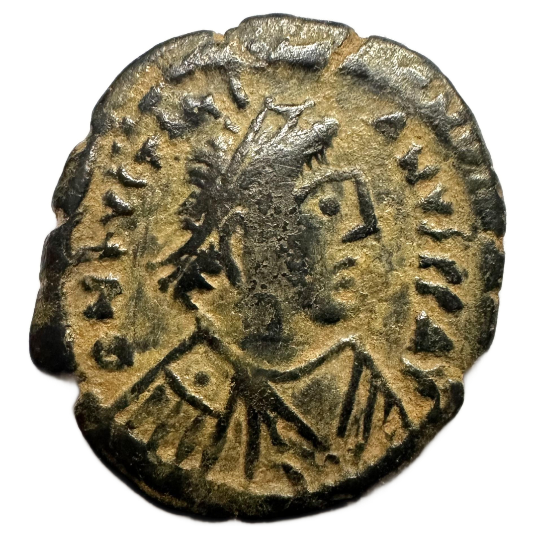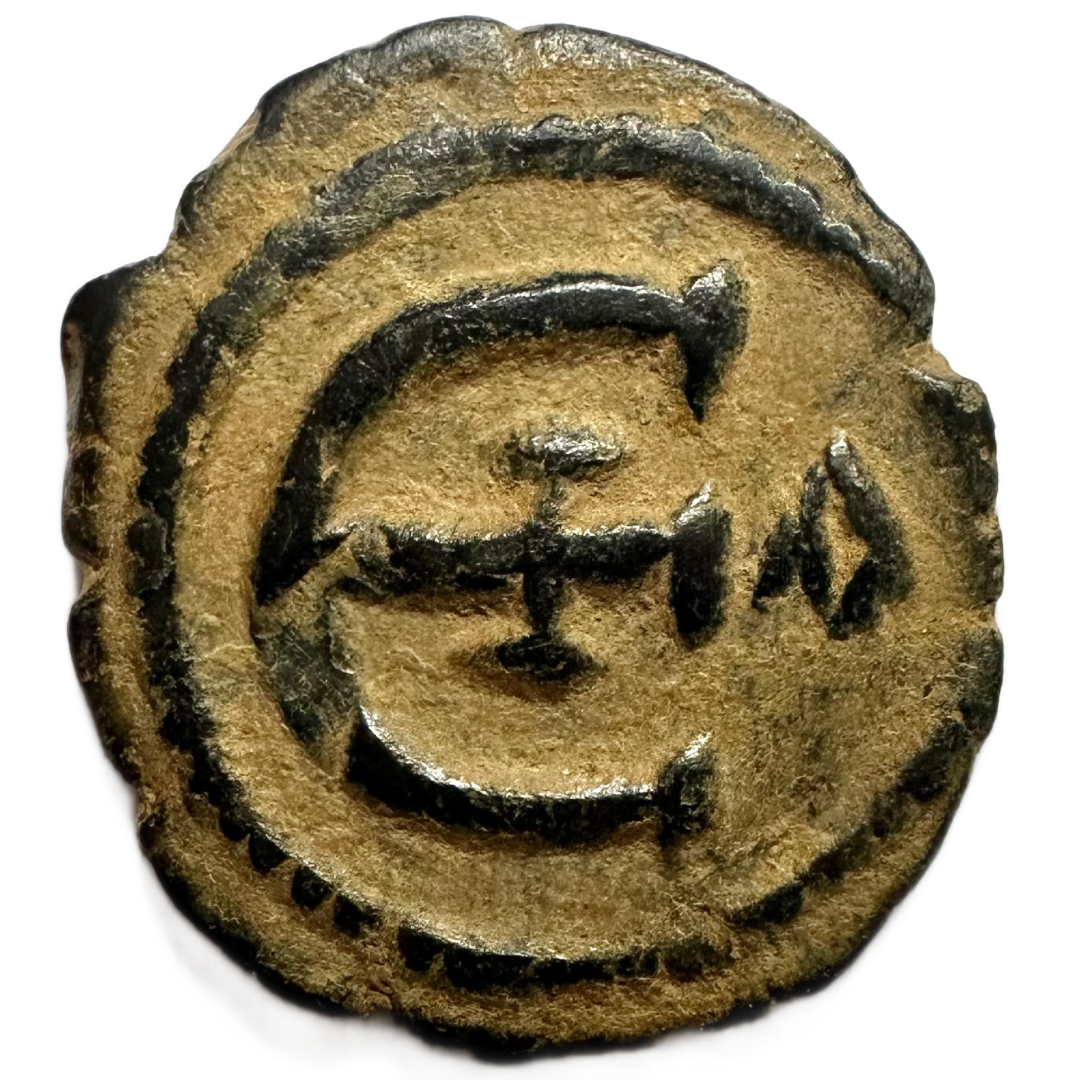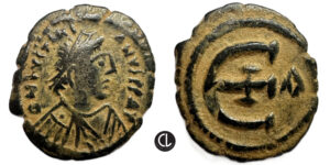 Note: This Pentanummium project imperial authority across the empire. The reverse bears a large “Є” with an “A”, marking its denomination, part of Justinian’s systematic monetary reforms that strengthened Byzantine coinage and reinforced the emperor’s presence even in small bronze change.